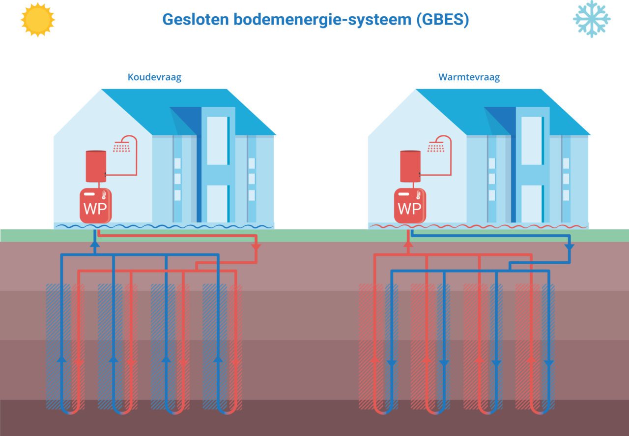 Het basisprincipe van een bodemenergiesysteem is het opslaan van warmte en koude in de bodem, zodat er met tussenkomst van een warmtepomp over een langere periode met hoog rendement energiewinning kan plaatsvinden.